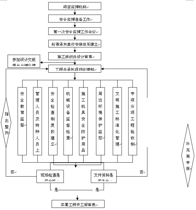 根據(jù)工程的特點(diǎn)施工現(xiàn)場的具體情況及工藝流程制訂一套相應(yīng)的科學(xué)的安全監(jiān)理程序,對(duì)不同的工程制定相應(yīng)的檢測、驗(yàn)收方法和安全監(jiān)理工作制度達(dá)到有效監(jiān)理的目的,針對(duì)工程必須要熟悉并準(zhǔn)備安全監(jiān)理記錄和各種表格,以使安全監(jiān)理工作順利開展。