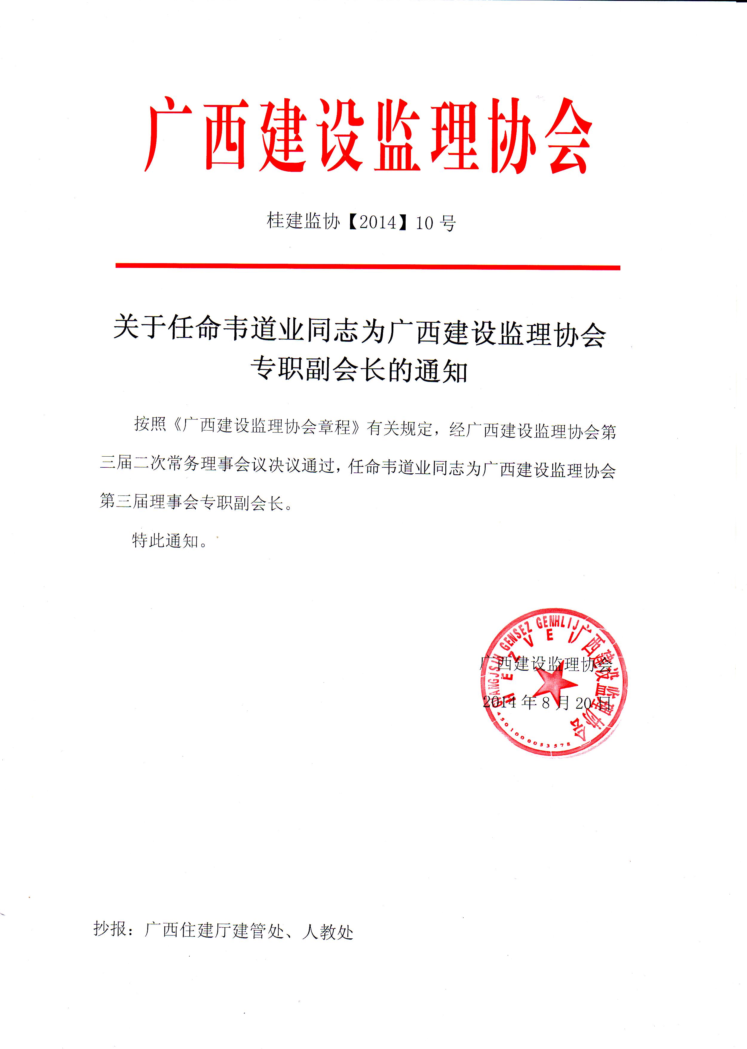 關于任命韋道業同志為廣西建設監理協會專職副會長的通知