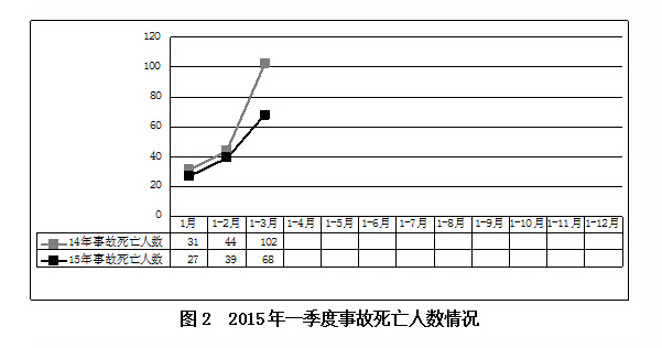 2015年一季度,全國共發生房屋市政工程生產安全事故52起、死亡68人,比去年同期事故起數減少39起、死亡人數減少34人(見圖1、圖2),同比分別下降42.86%和33.33%。