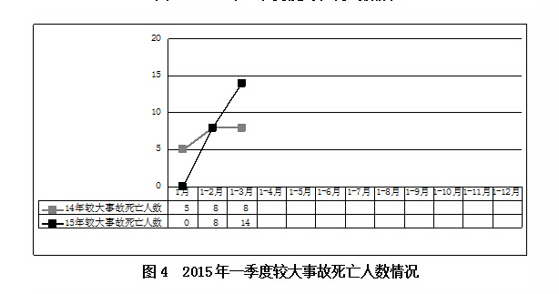 2015年一季度,全國共發生房屋市政工程生產安全較大事故3起、死亡14人,比去年同期事故起數增加1起、死亡人數增加6人(見圖3、圖4),同比分別上升50.00%和75.00%;未發生重大及以上事故。