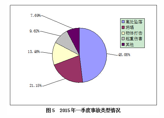 2015年一季度,房屋市政工程生產安全事故按照類型劃分,高處墜落事故25起,占總數的48.08%;坍塌事故11起,占總數的21.15%;物體打擊事故7起,占總數的13.46%;起重傷害事故5起,占總數的9.62%;機械傷害、車輛傷害、中毒和窒息等其他事故4起,占總數的7.69%(見圖5)。