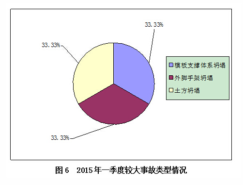 2015年一季度,共發生3起較大事故,其中模板支撐體系坍塌事故1起,死亡8人,分別占較大事故總數的33.33%和57.14%;土方坍塌事故1起,死亡3人,分別占較大事故總數的33.33%和21.43%;外腳手架坍塌事故1起,死亡3人,分別占較大事故總數的33.33%和21.43%。(見圖6)。