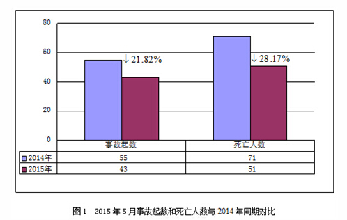 2015年5月,全國共發生房屋市政工程生產安全事故43起、死亡51人,比去年同期事故起數減少12起、死亡人數減少20人,同比分別下降21.82%和28.17%(見圖1)。