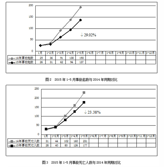 2015年1-5月,全國共發生房屋市政工程生產安全事故137起、死亡177人,比去年同期事故起數減少56起、死亡人數減少54人,同比分別下降29.02%和23.38%(見圖2、圖3)。