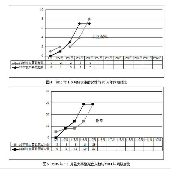 2015年1-5月,全國共發生房屋市政工程生產安全較大事故7起、死亡29人,比去年同期事故起數減少1起,同比下降12.50%,死亡人數持平(見圖4、圖5)。