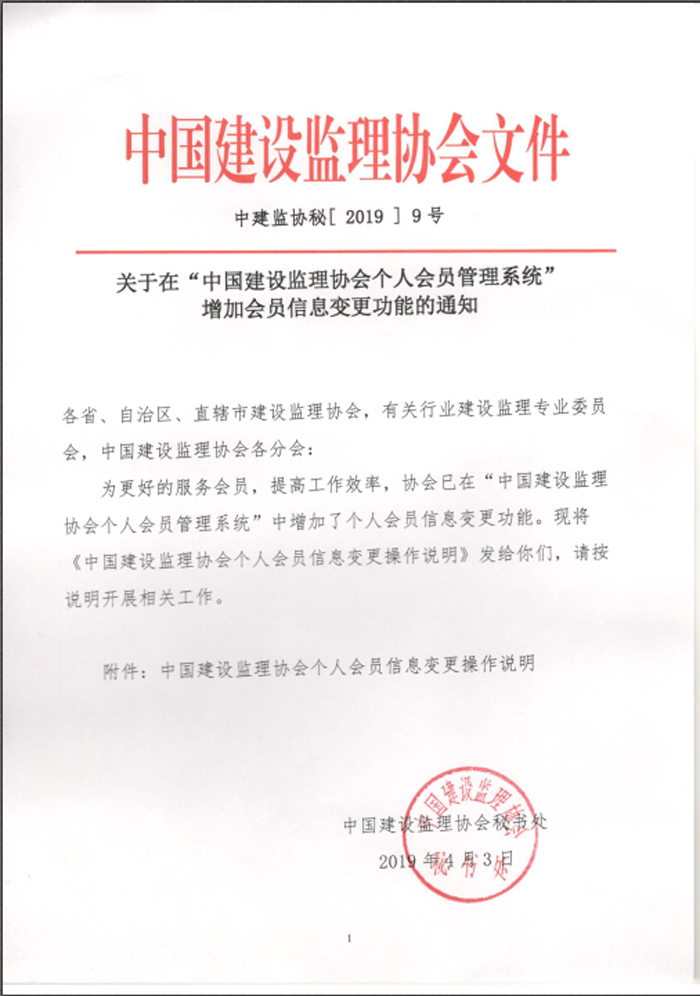 轉(zhuǎn)發(fā)中監(jiān)協(xié)關(guān)于在“中國(guó)建設(shè)監(jiān)理協(xié)會(huì)個(gè)人會(huì)員管理系統(tǒng)”增加會(huì)員信息變更功能的通知