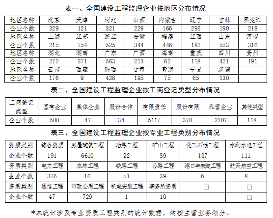 根據(jù)建設工程監(jiān)理統(tǒng)計調查制度相關規(guī)定,我們對2018年全國具有資質的建設工程監(jiān)理企業(yè)基本數(shù)據(jù)進行了統(tǒng)計,現(xiàn)公布如下: 一、企業(yè)的分布情況 2018年全國共有8393個建設工程監(jiān)理企業(yè)參加了統(tǒng)計,與上年相比增長5.64%。其中,綜合資質企業(yè)191個,增長15.06%;甲級資質企業(yè)3677個,增長4.02%;乙級資質企業(yè)3502個,增長11.78%;丙級資質企業(yè)1013個,減少8.49%;事務所資質企業(yè)10個,增長150%。具體分布見表一~表三: